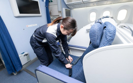 快適な空の旅をお約束するハード面での気配り、それはキャビン内の美観や衛生がいき届いているかどうか、また必要な用品類が揃っているかどうかにかかっています。つねにお客さまの立場から快適な旅とはなにか考え、客室内のクリーニングから雑誌、毛布、化粧品などのセッティングまでを行い、くつろぎの空間を演出いたします。